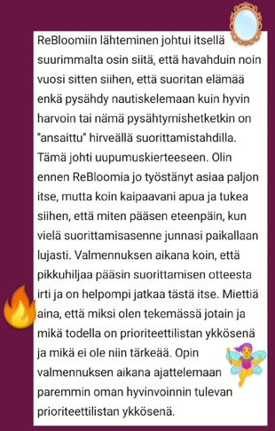 “Vihdoinkin pystyn hengittämään arjessani! Herään aamuisin toiveikkaana ja odotan innolla, mitä ihmeitä päivä tuokaan. Arjessani on tilaa pysähtyä itseni äärelle ja olen oppinut sallimaan hyvän elämääni, sillä olen kaiken sen nautinnon ja onnen arvoinen. Rakastan itseäni kokonaisena ja elän viimeinkin itselleni täysillä. Olen ylpeä tästä pienin askelin toteutuneesta elämänmuutoksesta ja niistä ihmeistä, joita se on tuonut elämääni. Uudenlaisen elinvoiman ansiosta tuntuu, että mikä vain on mahdollista!”